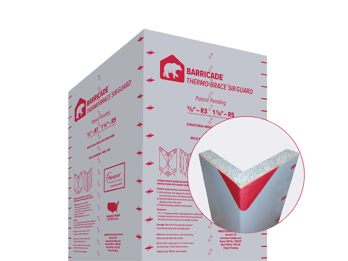 Patent-pending Barricade Thermo-Brace GUARD is an energy-efficient, structural sheathing that wraps around the corner of a structure, creating a complete enclosure that joins two separate walls into one continuous unit, while providing structural, WRB, and AIB benefits. Thermo-Brace GUARD stops air leaks and moisture penetration at corners and eliminates the need for corner flashing, saving time and money for builders, architects, contractors, and homeowners.
