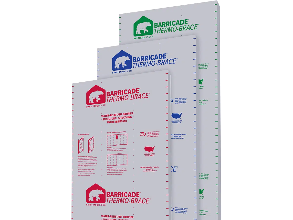 Simplify your building process with Barricade® Thermo-Brace® Structural Sheathing, the innovative solution that combines three essential functions in one easy installation. This high-performance sheathing provides superior structural support, a dependable weather barrier, and enhanced insulation, all in a single product. Ideal for both residential and commercial projects, Thermo-Brace® Structural Sheathing streamlines construction while delivering exceptional durability and energy efficiency. Choose Barricade® for a smarter, more efficient building solution.